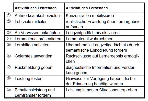 Es ist nicht damit getan, am Ende des Jahres eine Prüfung anzusetzen und auf gute Ergebnisse zu hoffen. Die SchülerInnen müssen darauf im Rahmen des Unterrichts von entsprechenden LehrerInnen vorbereitet werden. Eine Ausgangsbasis bietet das Werk von Gagnè[3], welches folgende instruktionale Ereignisse definiert: